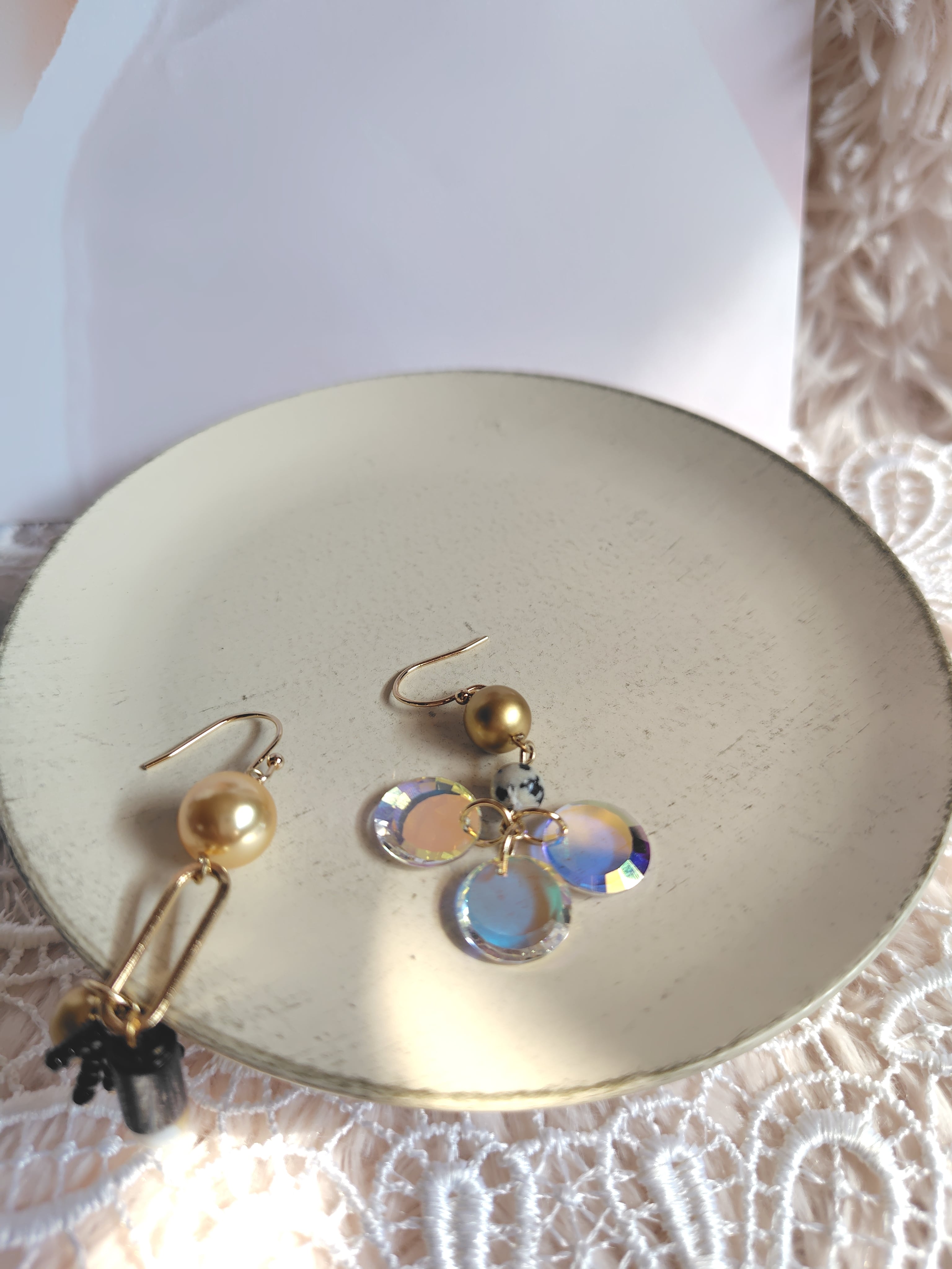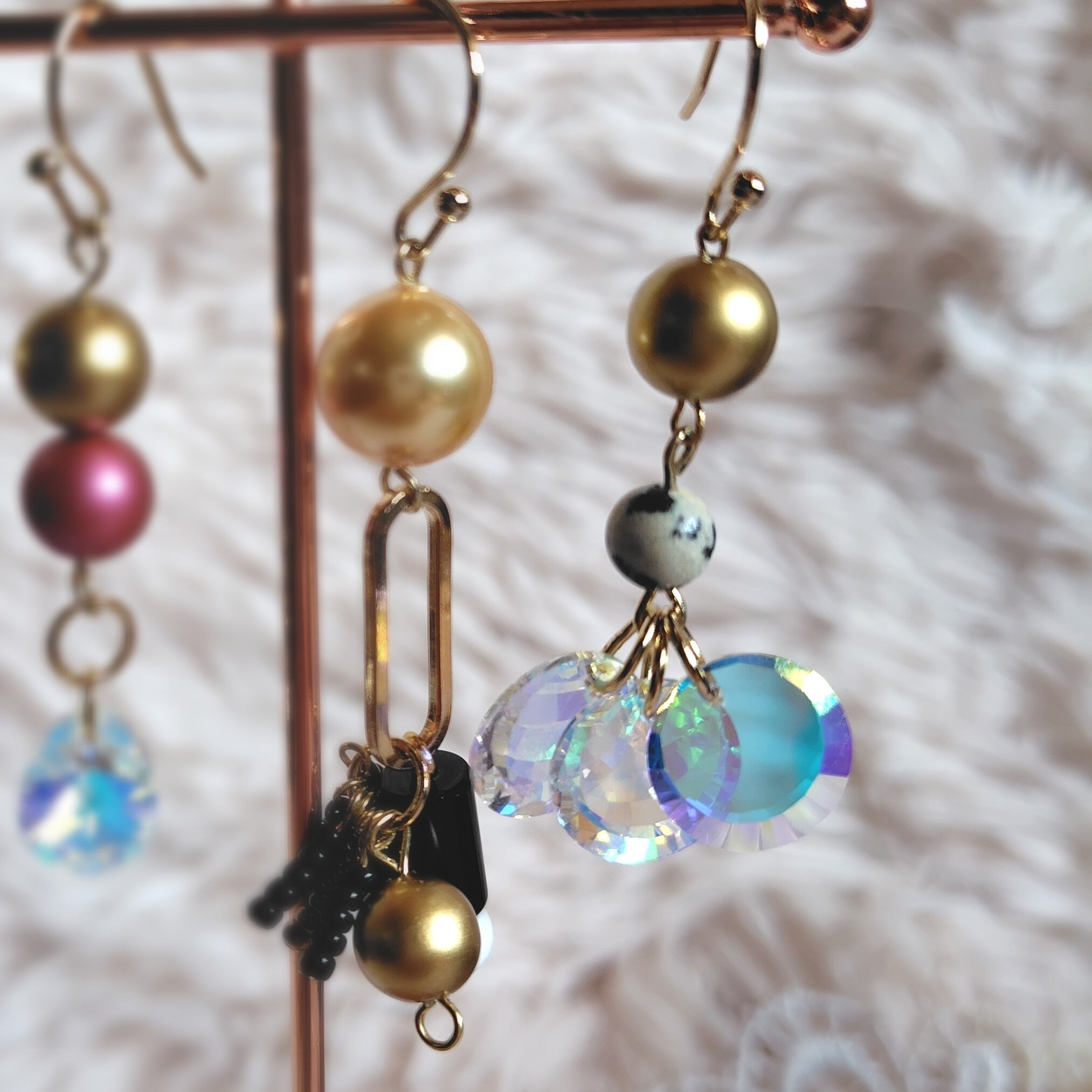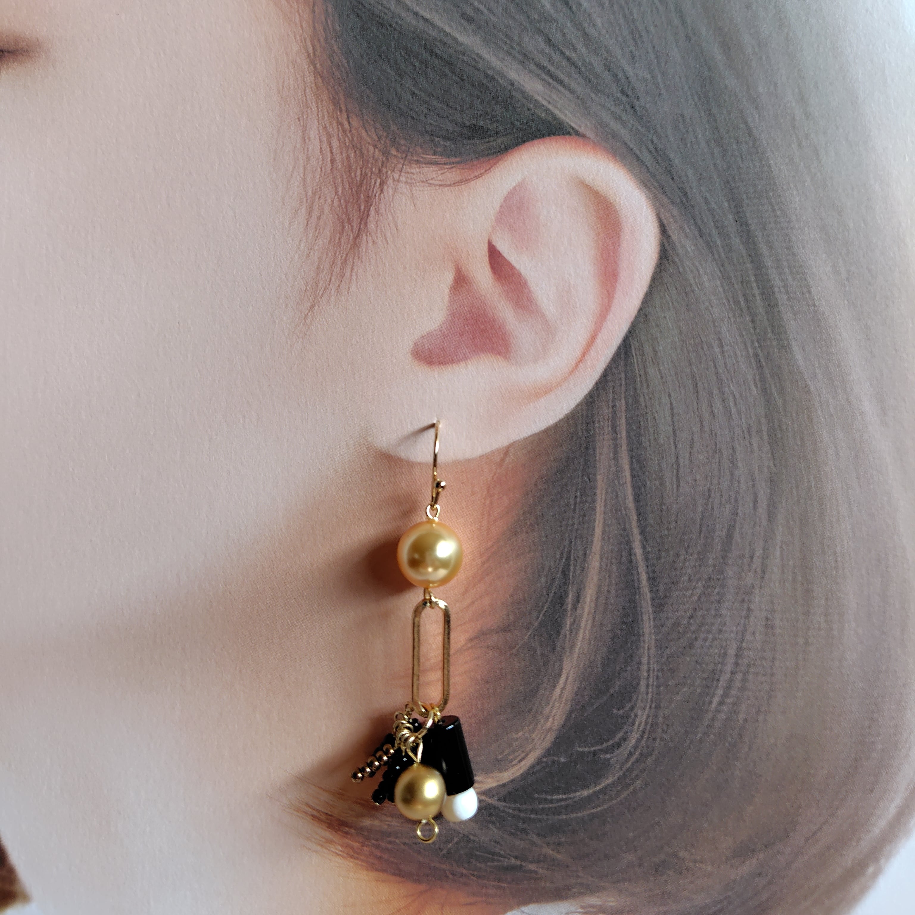 片側の黒っぽい方は手作りの古いビーズがシャランとゆれかわいいパーツがついていてゴールドの古いパールが効いてるデザインです