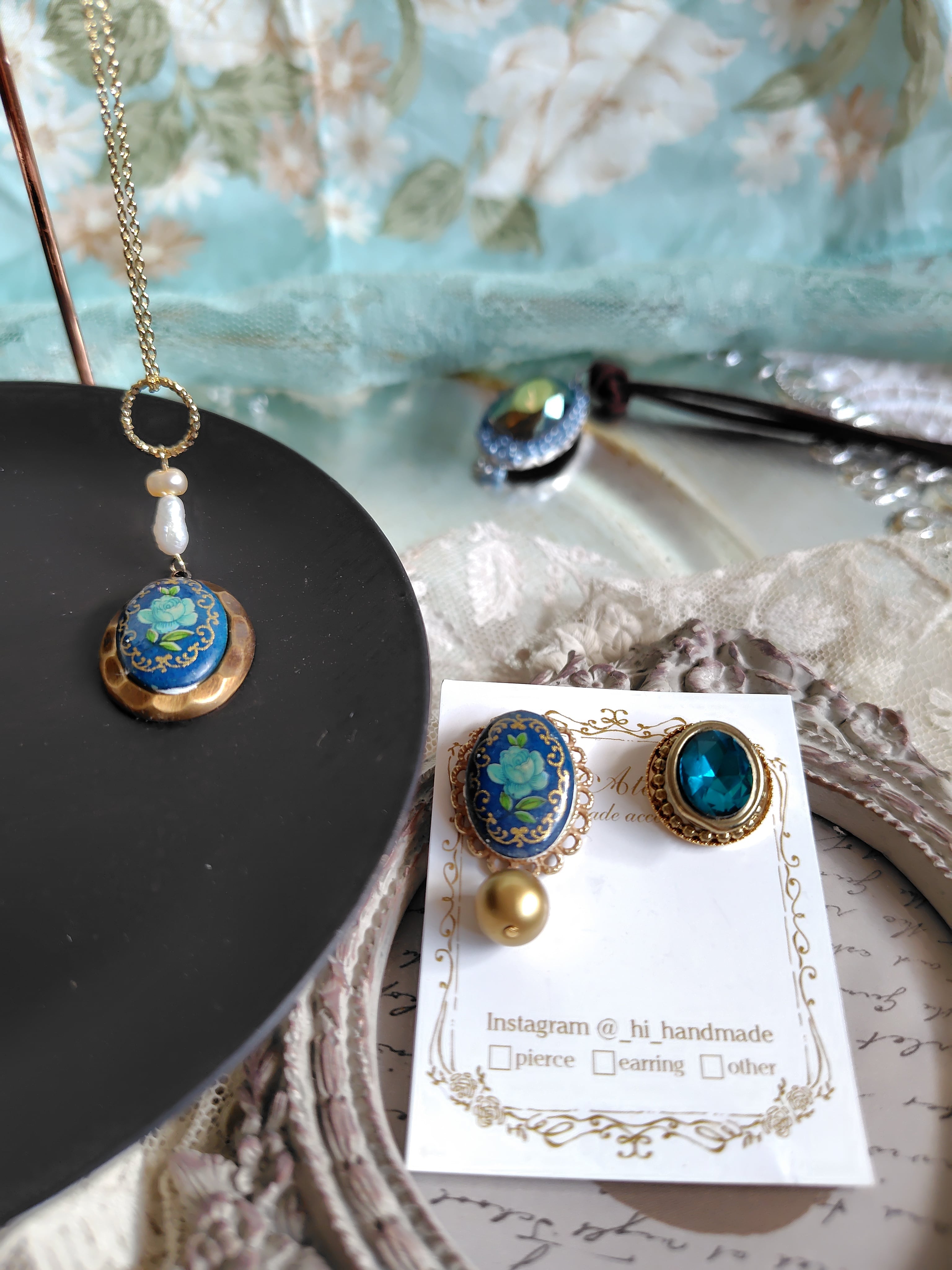 使用されている素材ブルーローズカボションはヴィンテージになっており、美しいブルーのバラが迎えてくれます。もう一つはこちらも美しい吸い込まれそうなブルービジューの手作りパーツ