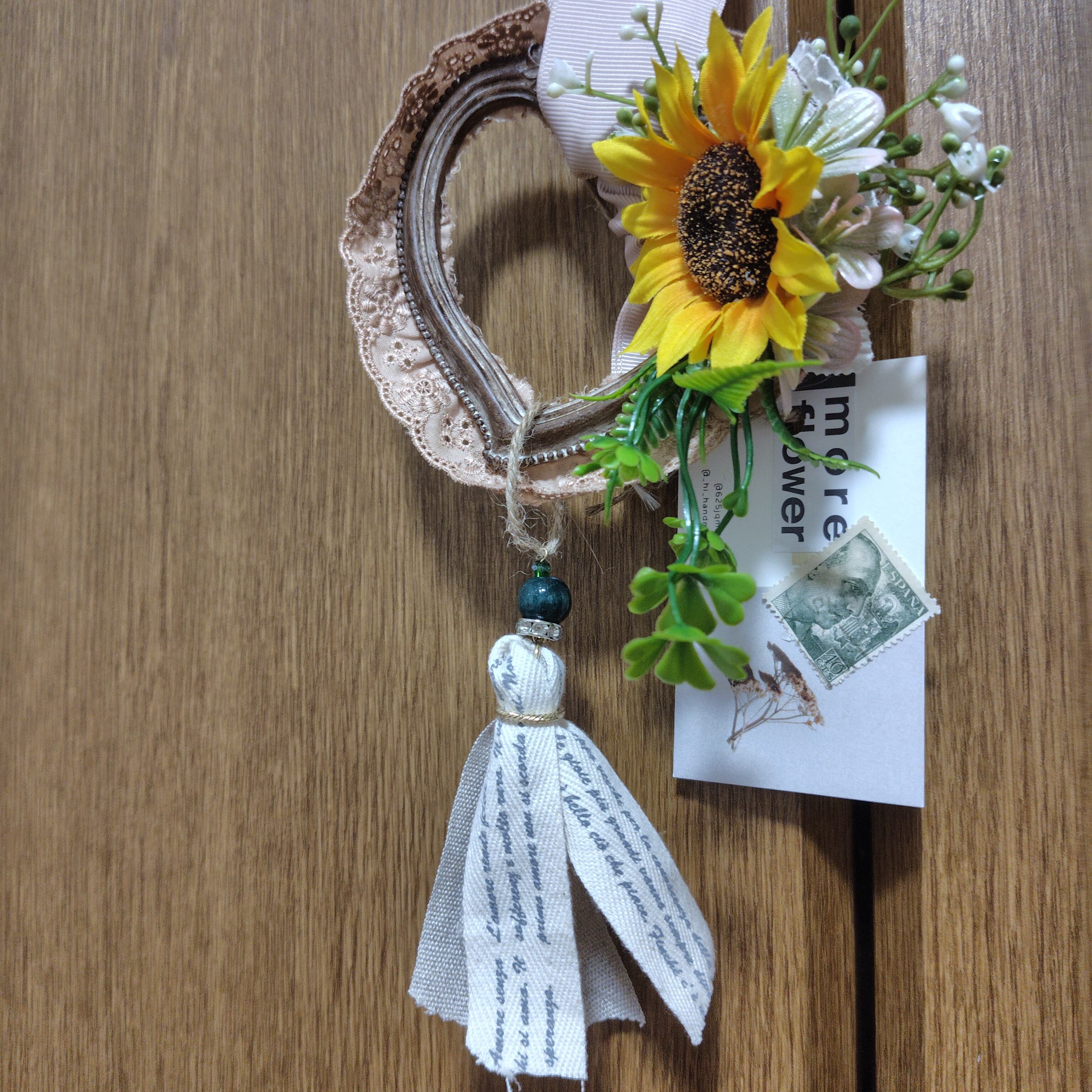 向日葵の花がアンティーク風のフレームに美しく収められており、どんなインテリアにも調和する素敵な一品です。壁に掛けてお楽しみいただくだけでなく、テーブルに立てかけたり、棚に飾ったりと、自由なアレンジも可能です。