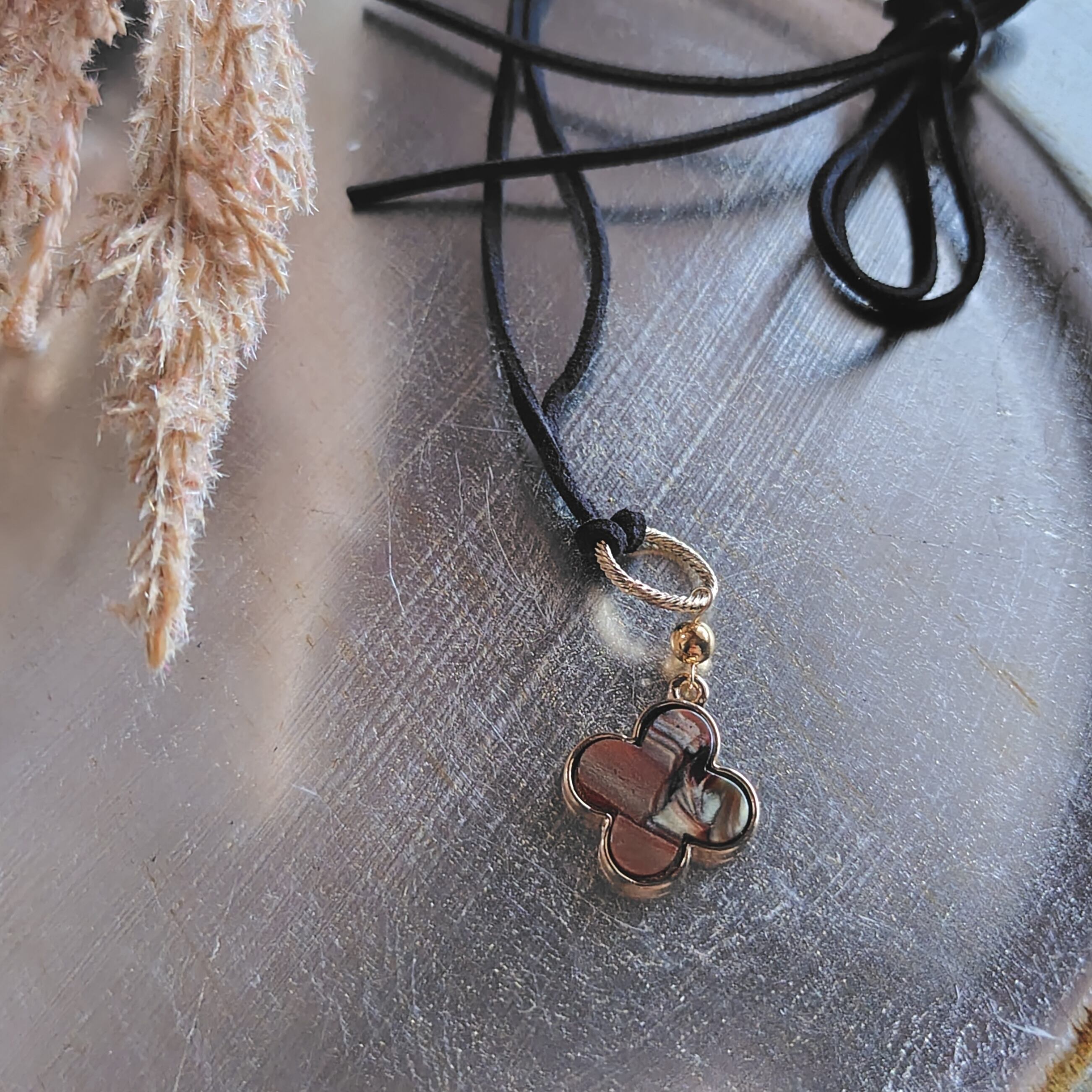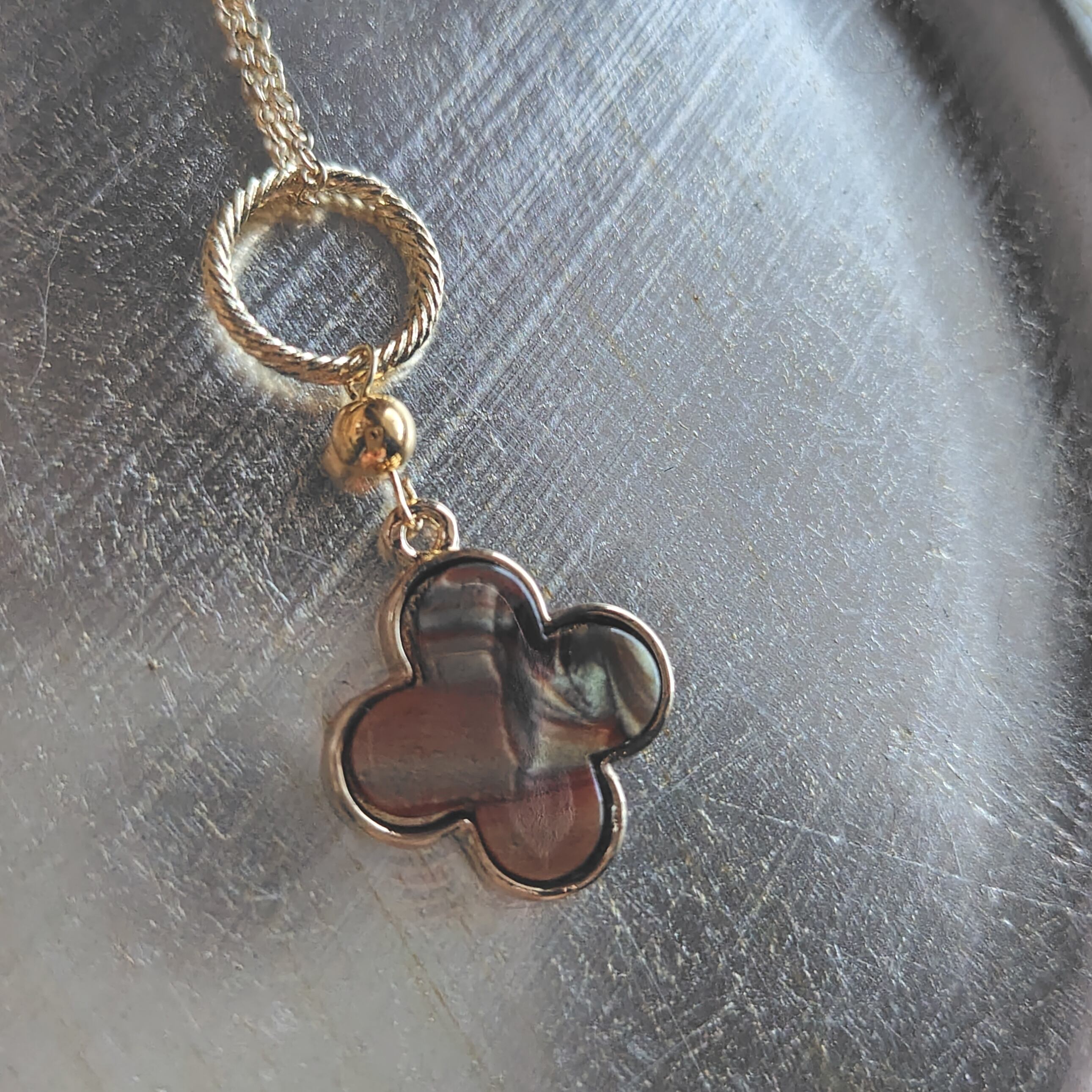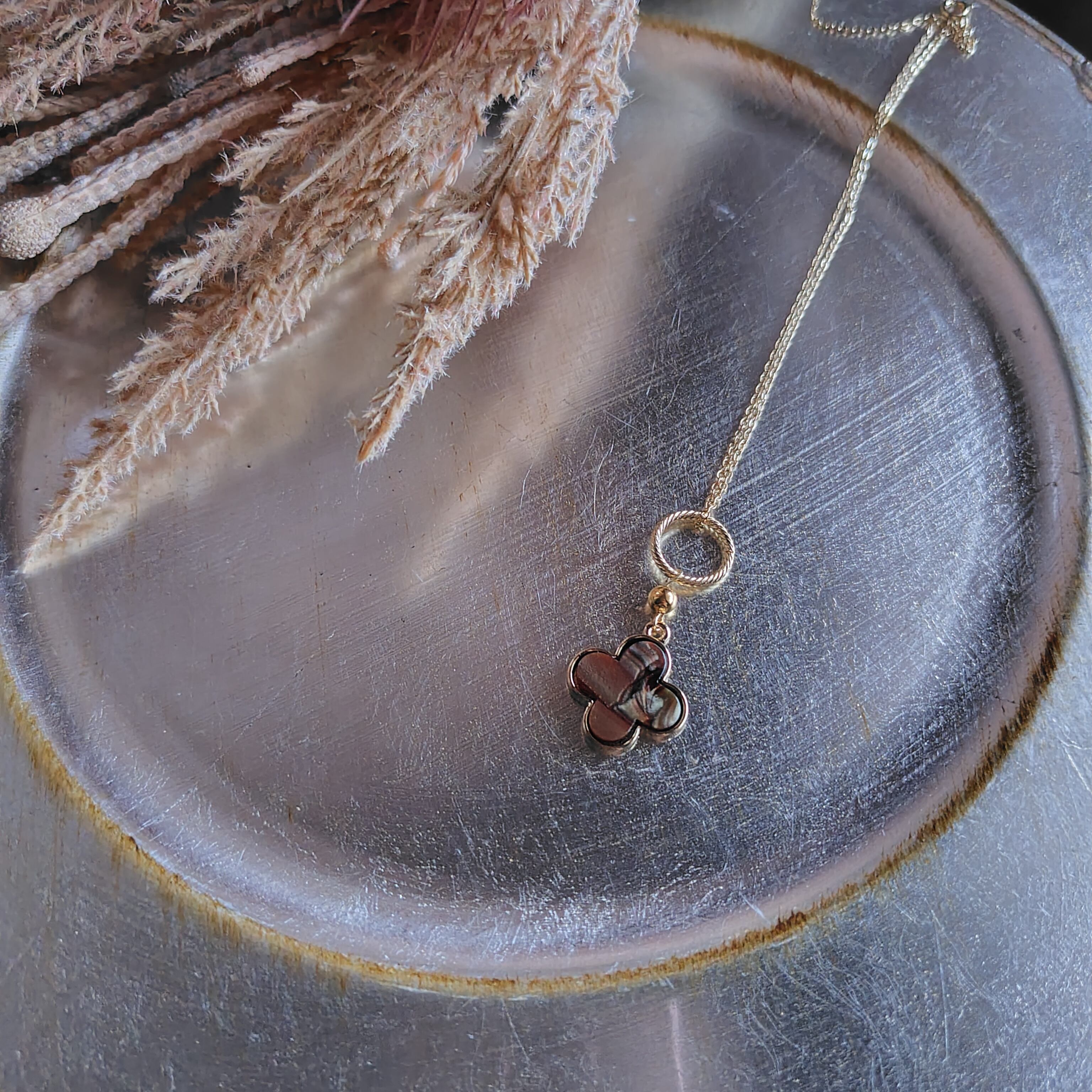 大きめのブラウンカラーのクローバーネックレスは、幸運を呼び込む四つ葉のクローバーモチーフが大胆にデザインされたネックレスです。