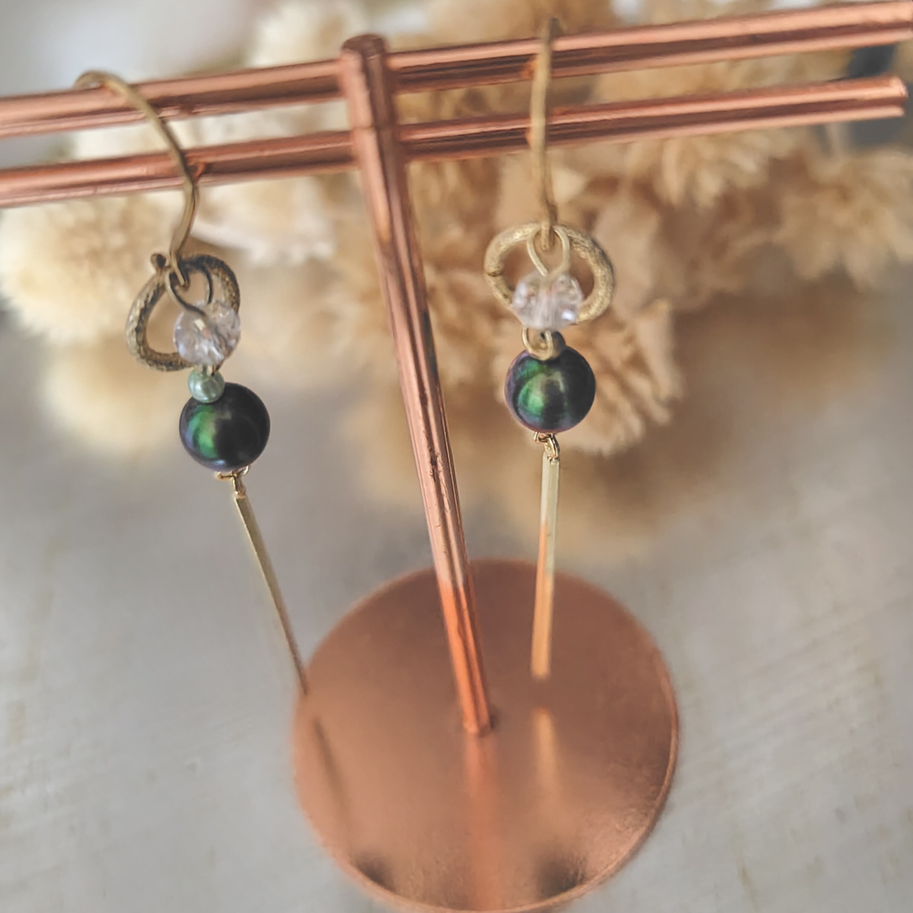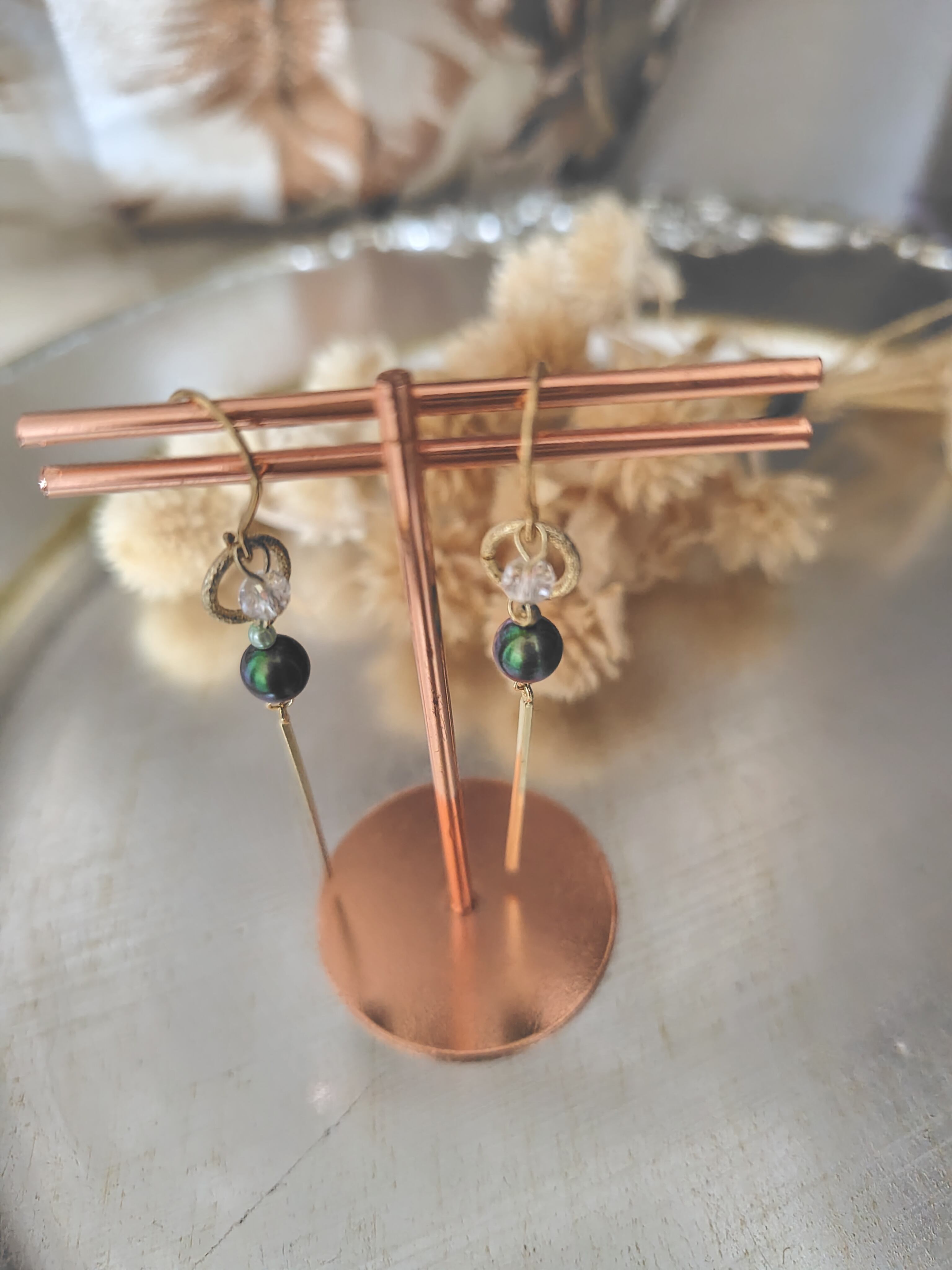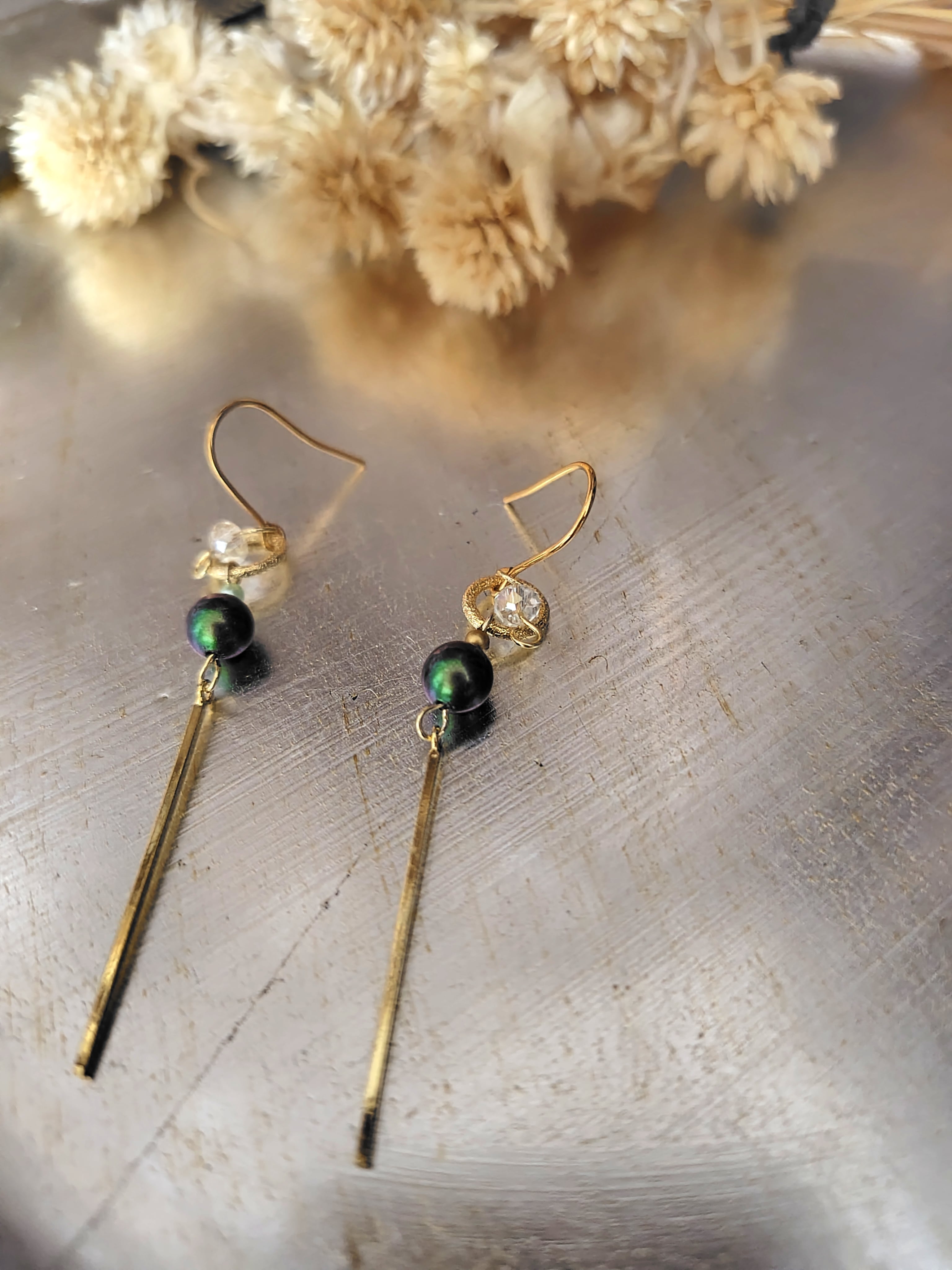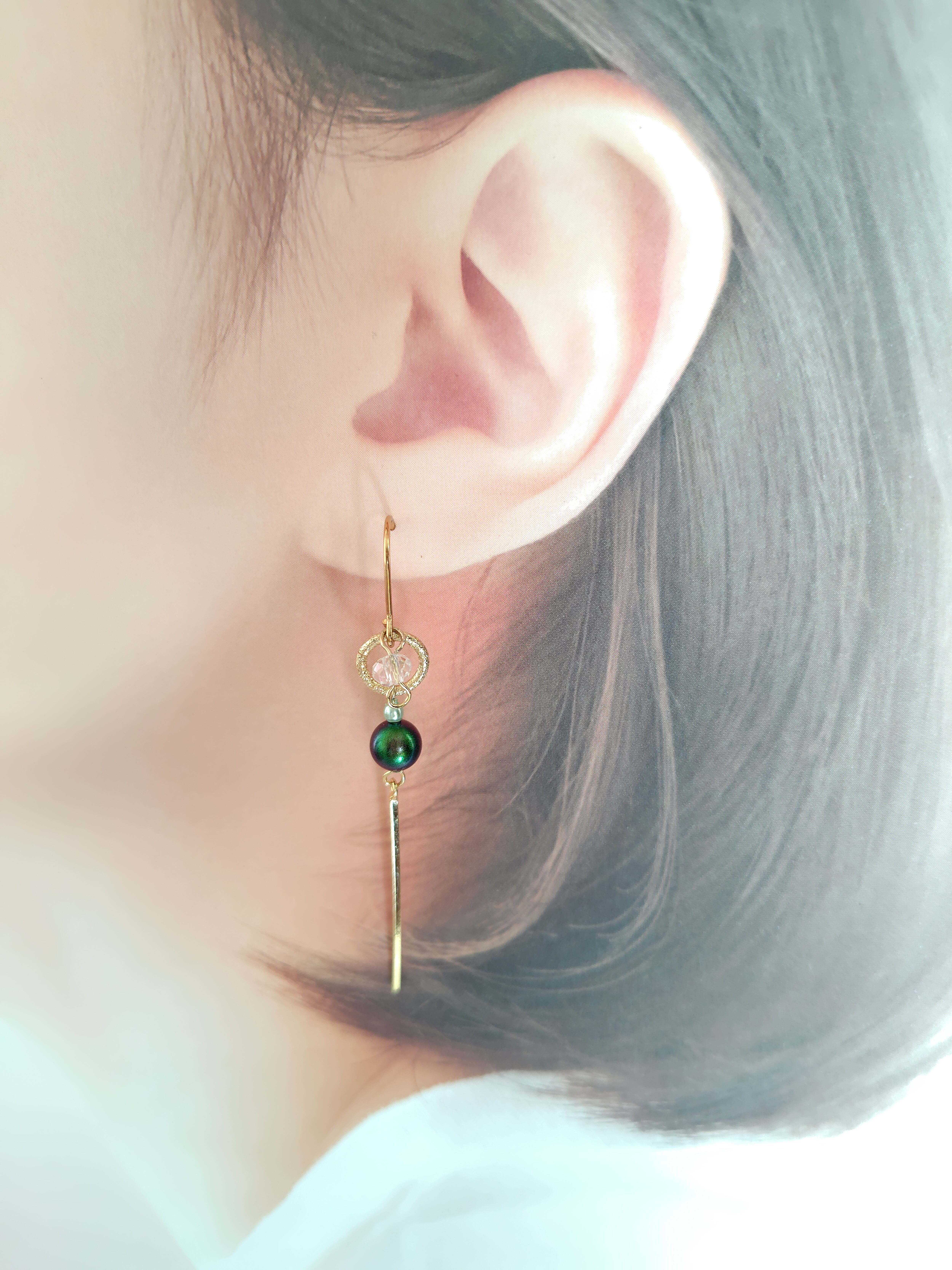 レアな魅惑的スワロ☆スカラベスグリーンパールが光る耳飾りです。小さなビーズは片方がアンティークゴールド、もう一つは水色ビーズそして