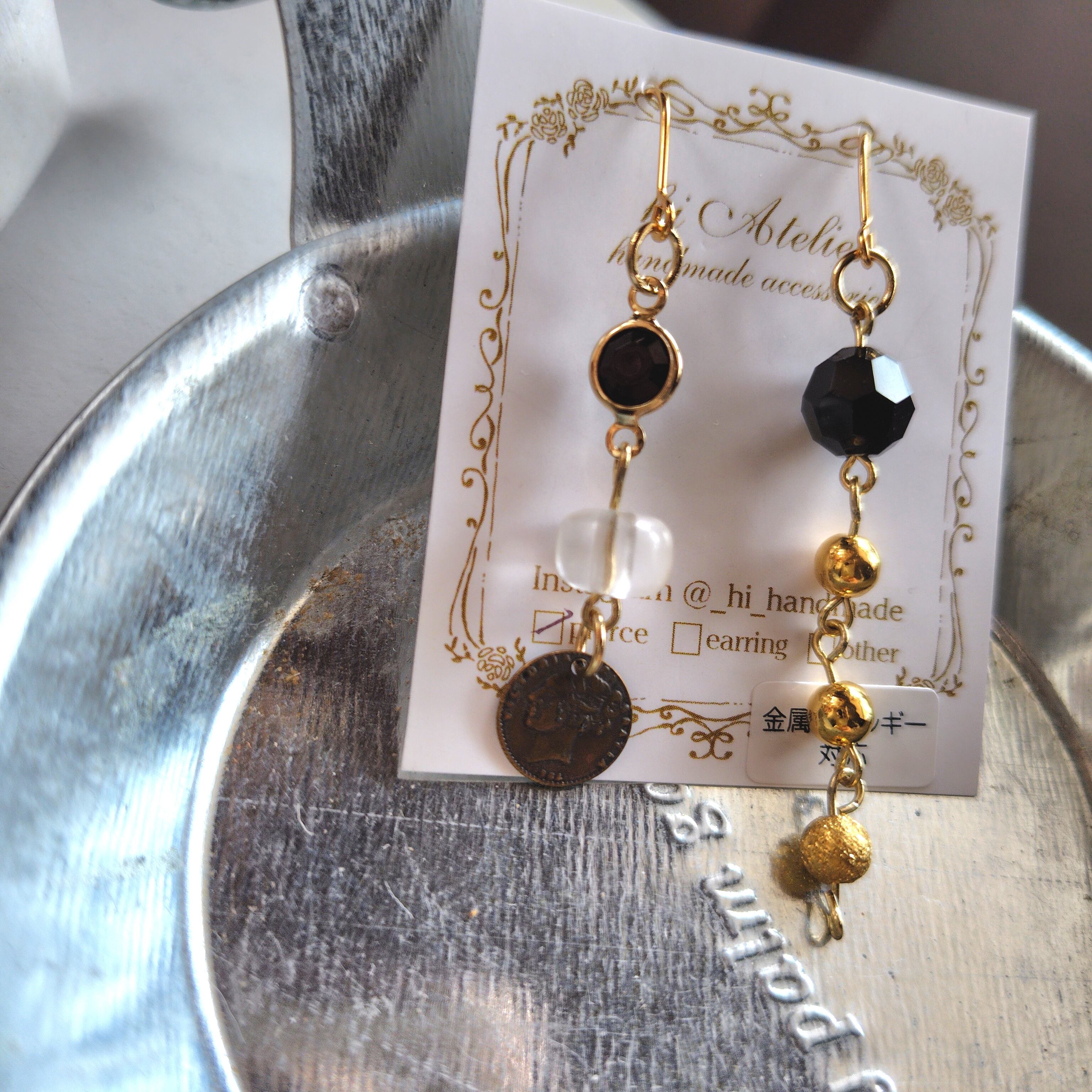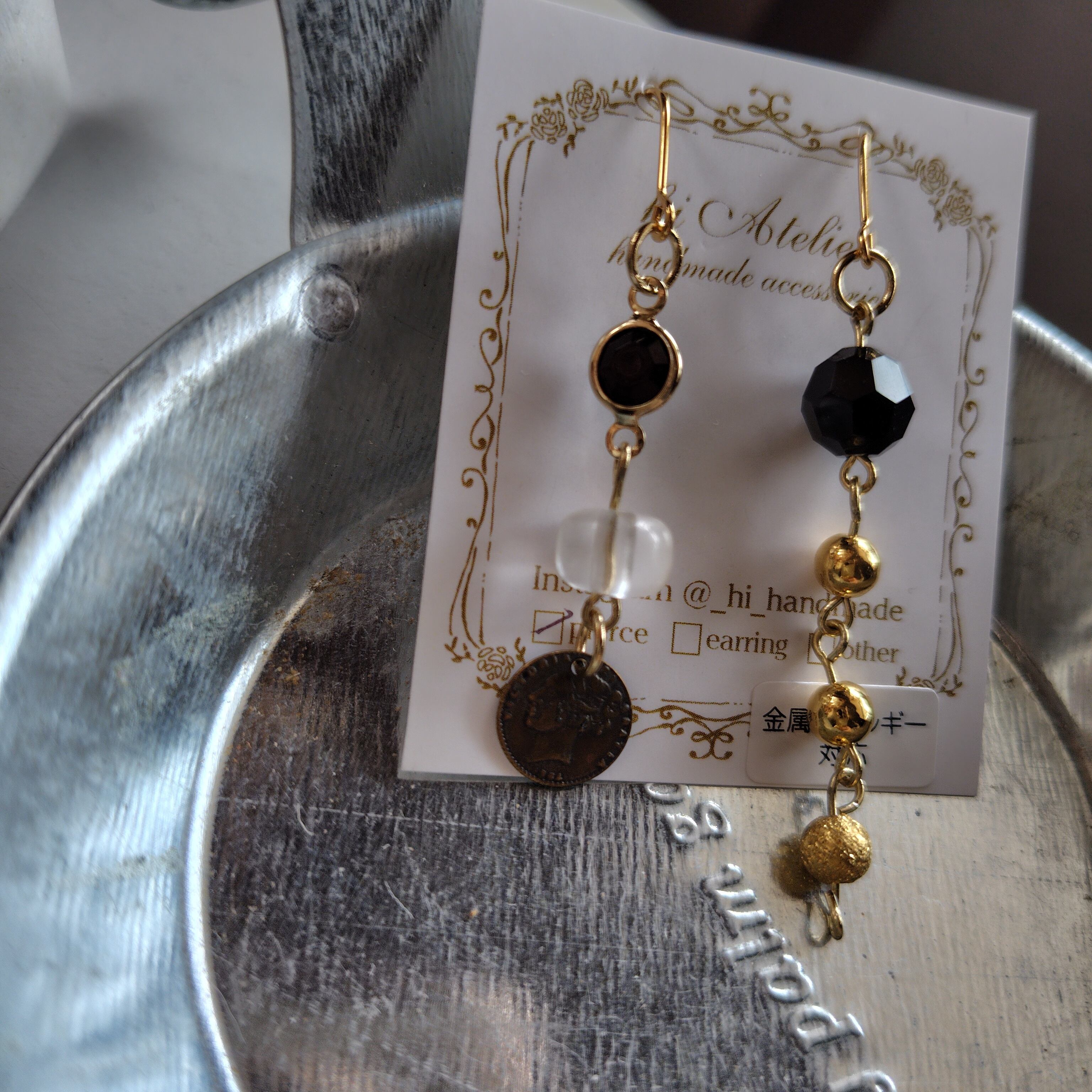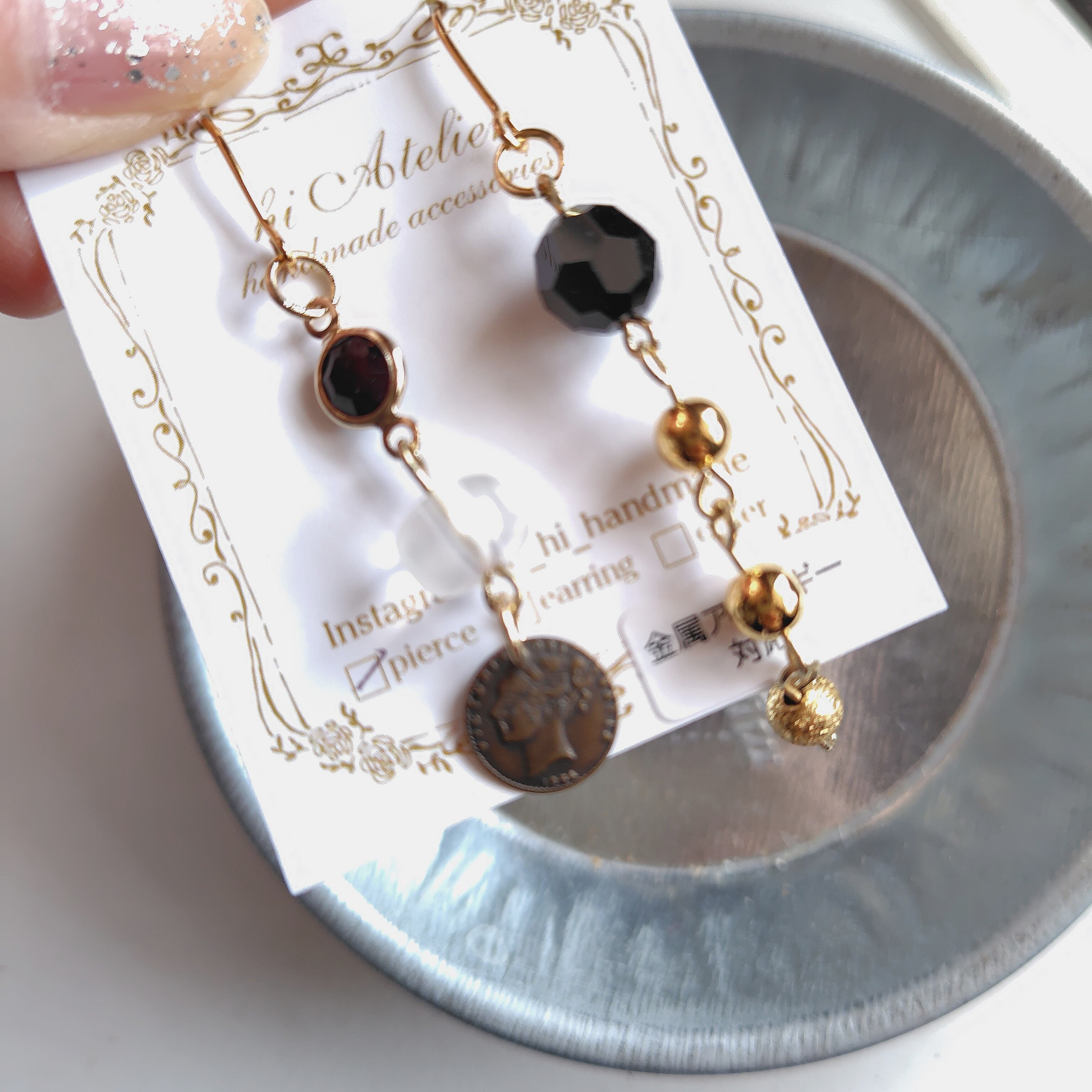 ゴールドの輝きとヴィンテージパーツなどの組み合わせは、耳元に上品なアクセントを与え、洗練された印象を演出します。動くたびに揺れるこのピアスが、あなたのスタイルに独自の魅力をプラスし、自信を持って身に着けることができるでしょう。